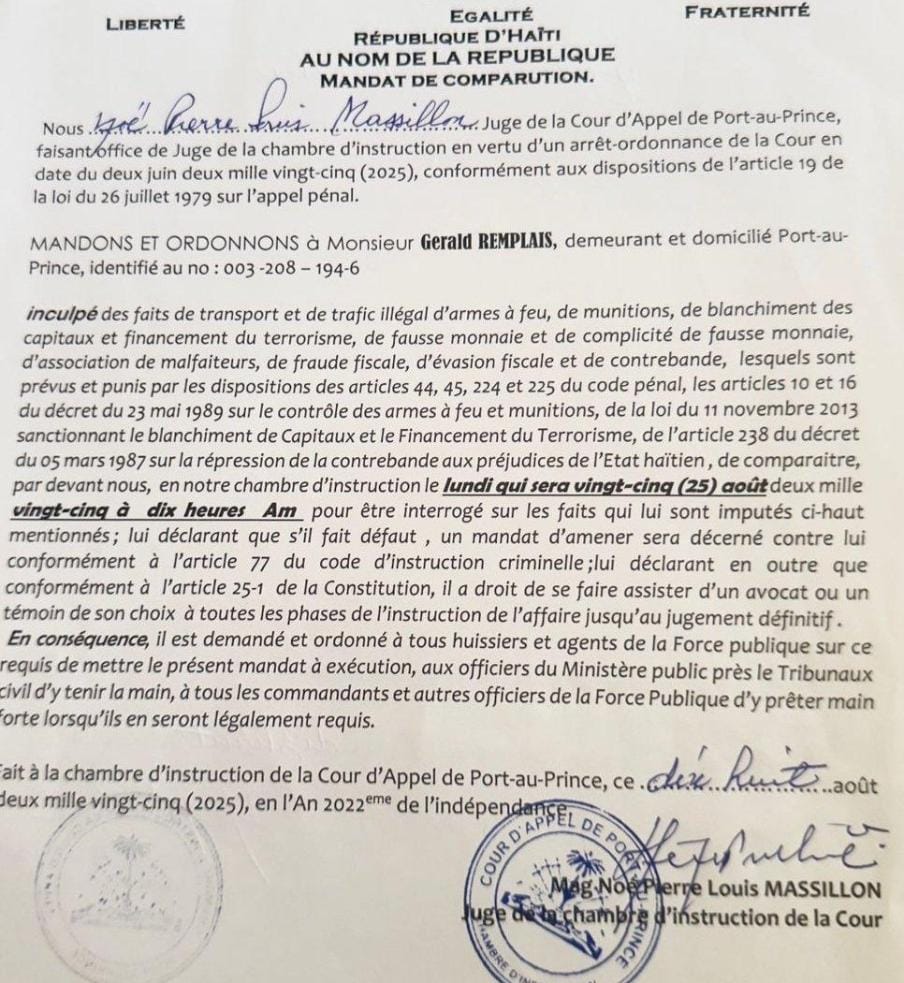 Pire encore, Gérald Remplais a ostensiblement ignoré une convocation de la Cour d’appel. Ce refus de comparaître constitue un acte de rébellion judiciaire et un affront direct à l’autorité de la justice haïtienne. Son nom étant formellement cité dans une ordonnance d’instruction, cette insubordination représente un crime d’une extrême gravité qui met en péril la sécurité nationale.